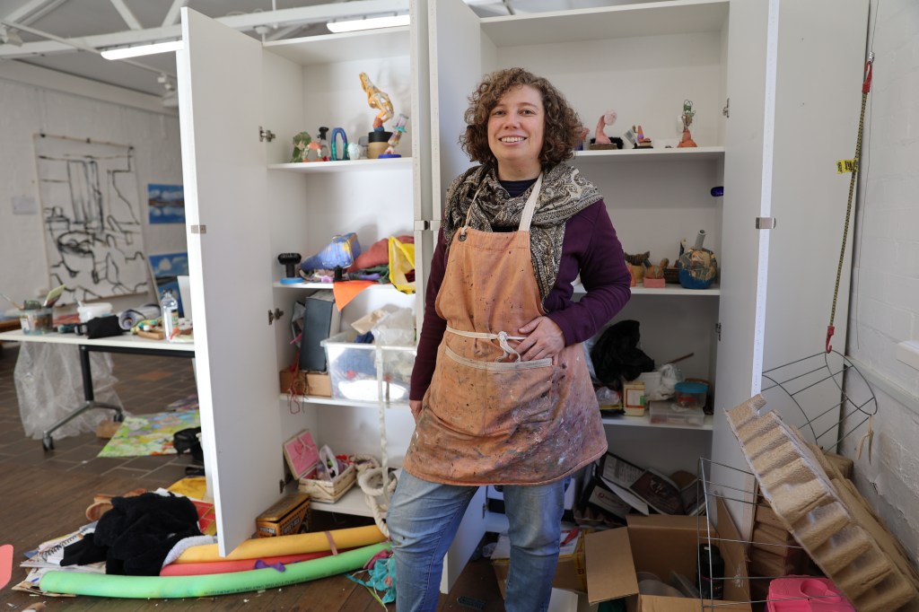 Kate Riley is a multi-disciplinary artist working between Cammeraygal land and Gumbaynggir country on the mid-north coast of NSW. Growing up in the Gumbaynggir rainforest of the Dorrigo plateau Kate has always drawn creative inspiration from her environment and from place. Influenced by the Australian grunge artists of the 90’s, particularly Mikala Dwyer and Sarah Goffman, Kate is highly motivated to work sustainably and focuses on using found and salvaged objects and materials. She draws and paints imagined 3D objects and then builds them out of papier mâché, cardboard, soft sculpture and other found materials. This becomes a cyclical process allowing the objects and paintings to become self-generative and self-referential.