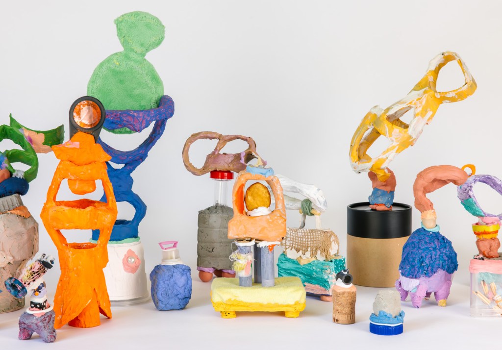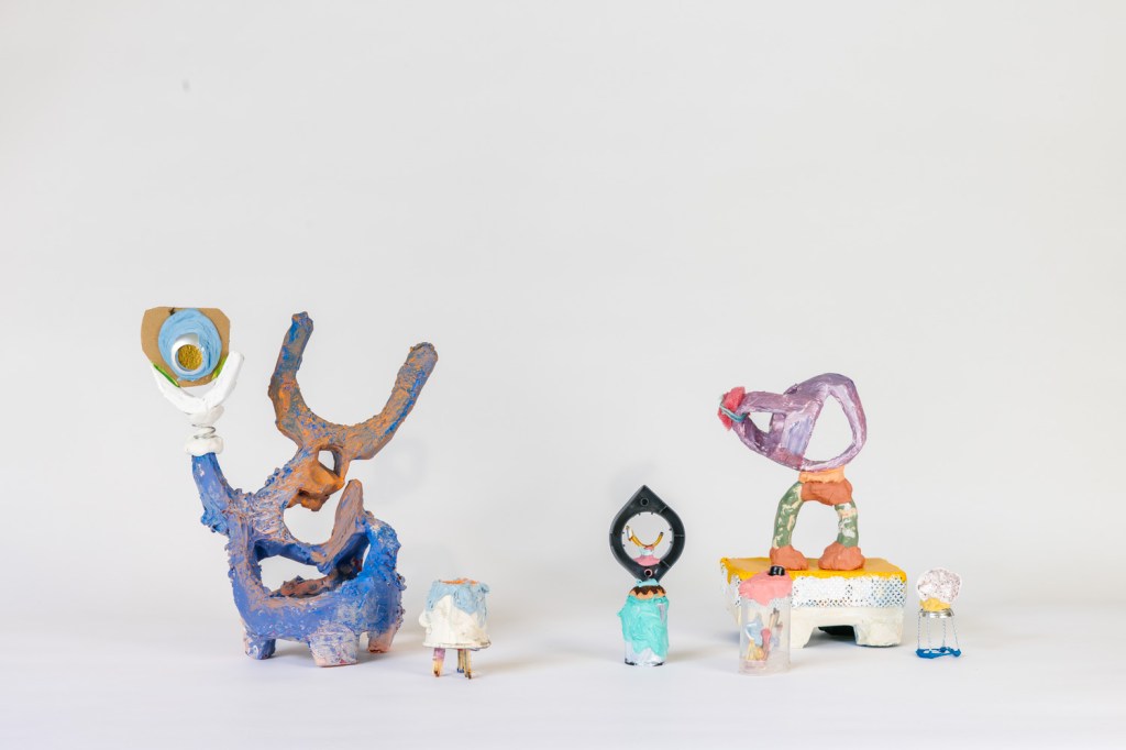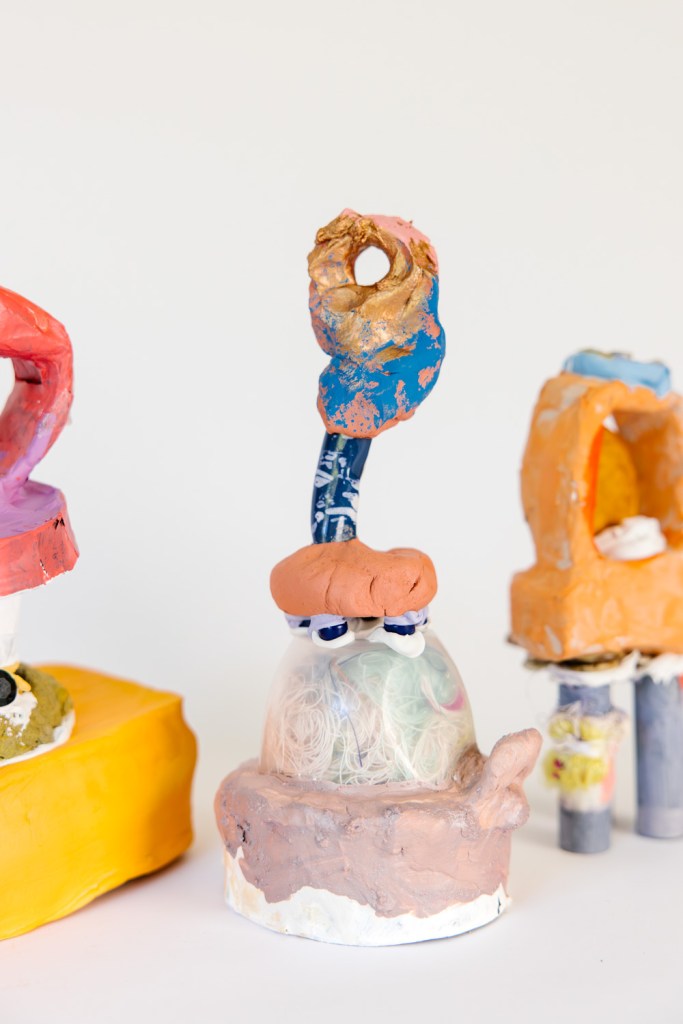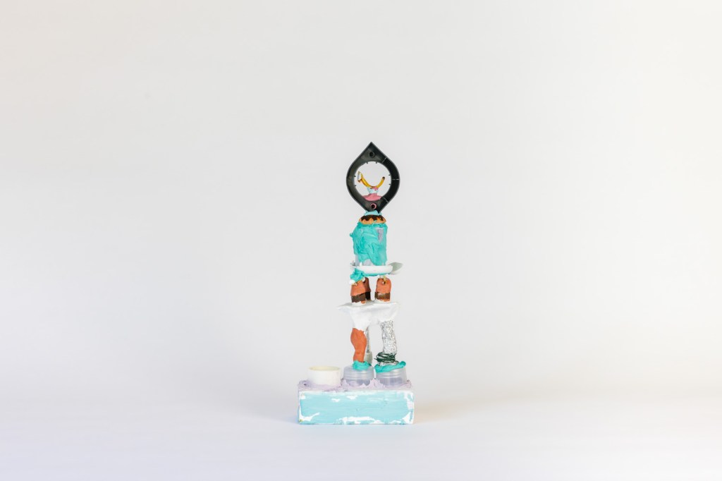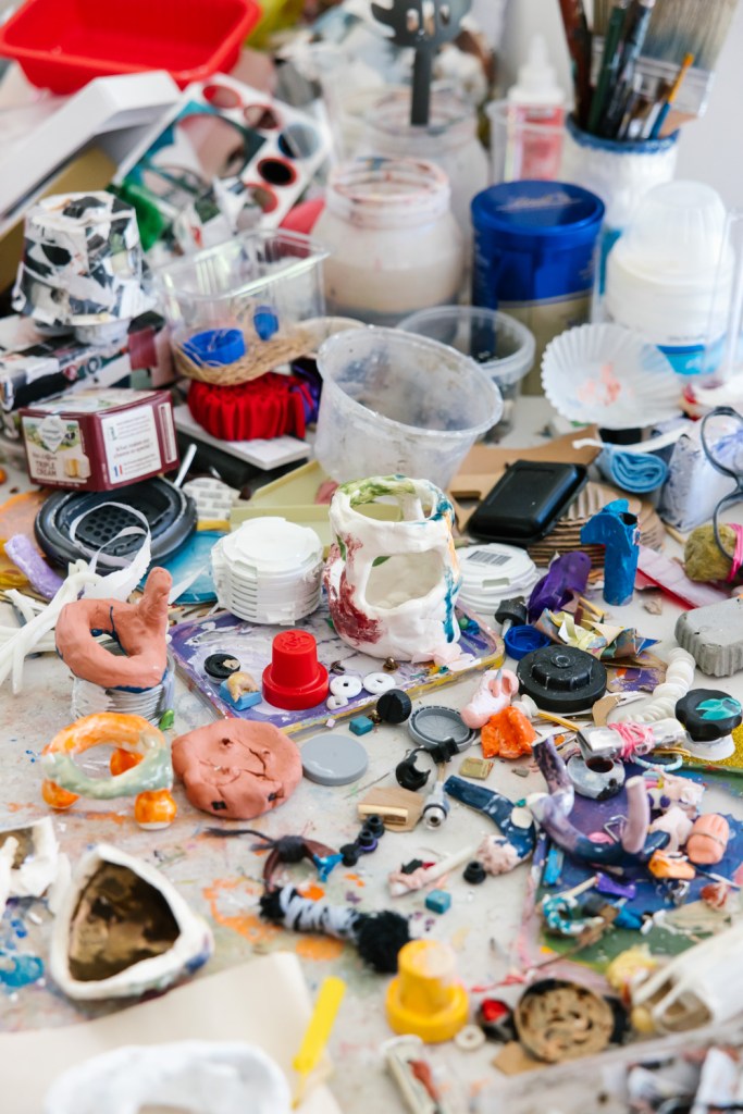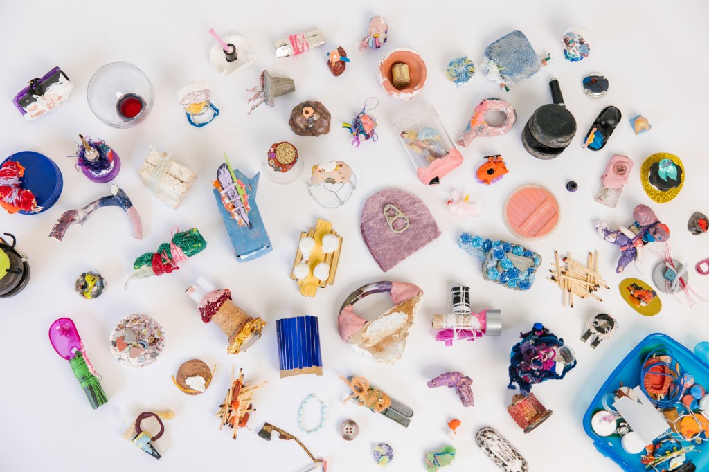 I am making art at every moment, my mind swims with it. I walk in the city and the suburbs and find small, discarded objects. I squirrel them away into my special yellow bag. These treasures come with me into the studio and play together, climbing higher to reach the sky, sometimes precarious, sometimes confident against toppling. When I’m not looking, they resolve themselves, telling me that they belong to the friends beside them. I am now accustomed to having much of my progress cannibalised from one artwork into another. It’s my turn to add the glue. You can see they have a new stance that means they are confident to be seen. I can trust (patiently or impatiently) in the studio gravity.